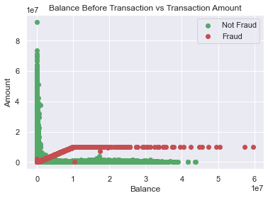 Lastly, there appears to be a weak positive relationship between amounts and destination account balances, which was observed earlier in the correlation matrix.