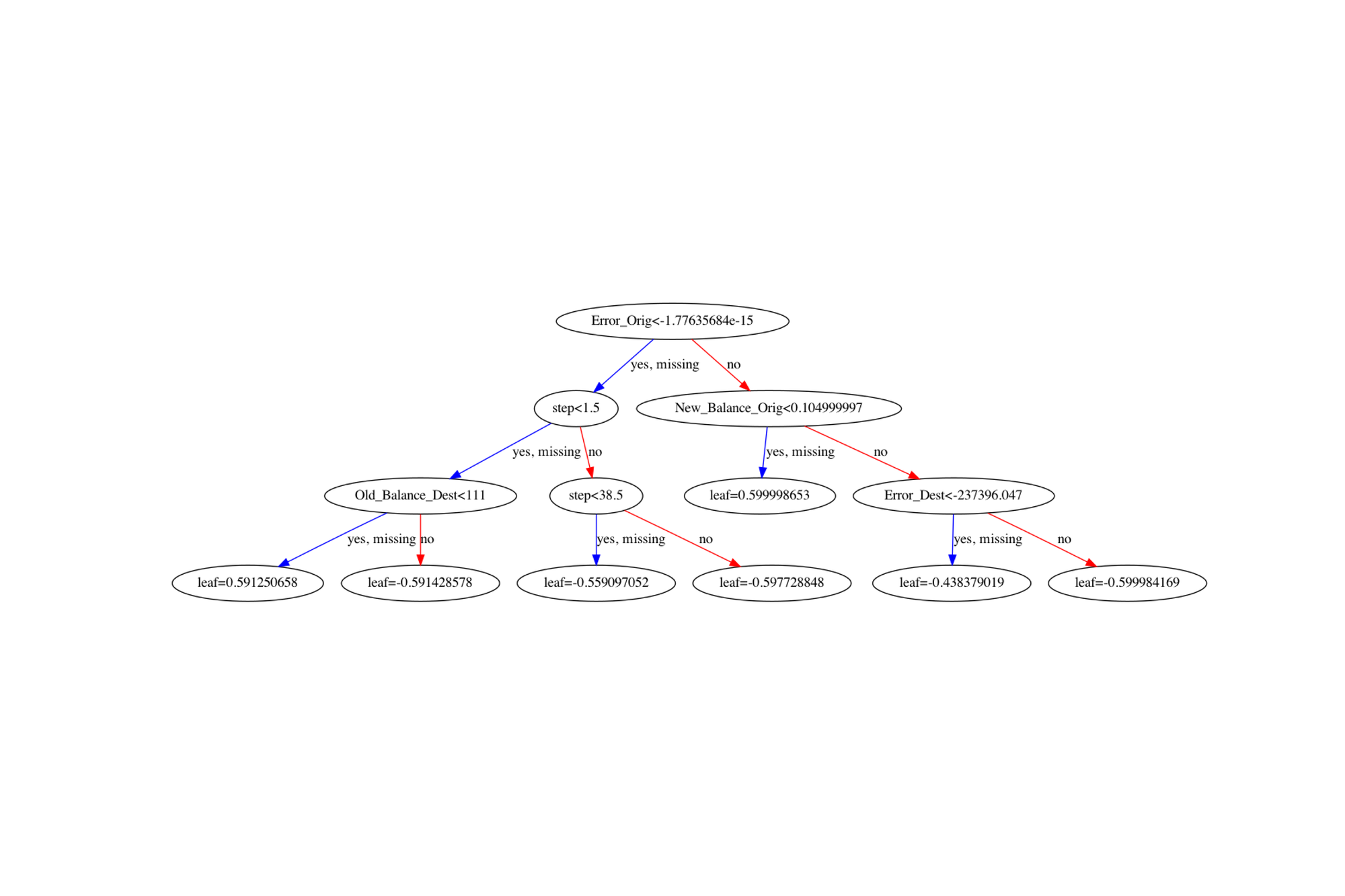 The XGBoost classifier was used to train the 20/80 train/test split data. Further, Error columns for Origin and Destination were added to normalize values. The accuracy was found to be 0.9999530726256983 and F1 macro score was 0.9937862376528303. Shown below is the corresponding decision tree generated.